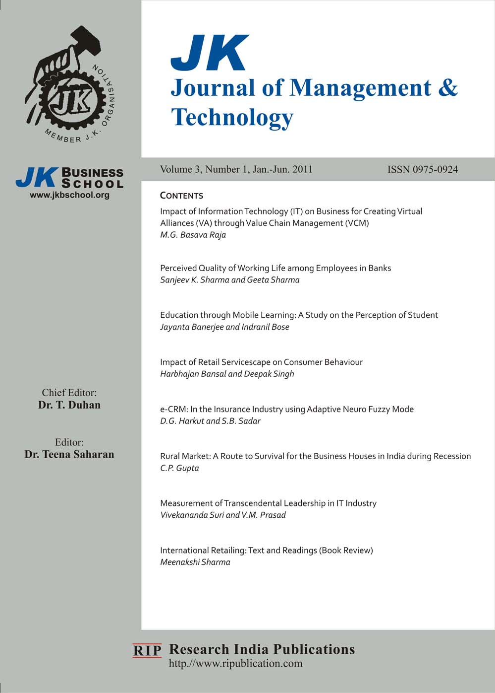 Gurgaon – 122102 Haryana, Aim and Scope: The JK Journal of Management & Technology (JKJMT) is a refereed Journal dedicated to publish empirical research that tests, extends, or builds management and technology theory and contributes to practice. All empirical methods – including, but not limited to, qualitative, quantitative, field, laboratory, and combination methods – are welcome. To be published in JKJMT a manuscript must make strong empirical and theoretical contributions, and highlight the significance of those contributions to the management and technology fields. JKJMT is not restricted to any particular discipline, level of analysis, or national context. Publication Date and Frequency: Two issues per year. Submission: Authors are requested to submit their papers electronically to manoranjan@jkbschool.org with mention journal title (JKJMT) in subject line. Annual Subscription Price: Library/ Institutional: Print (plus online free): US$380.00 Online Only: US$360.00 Individual/ Personnel: Print (plus online free) US$180.00 Online Only: US$160.00 Inside India: Rs.3000.00